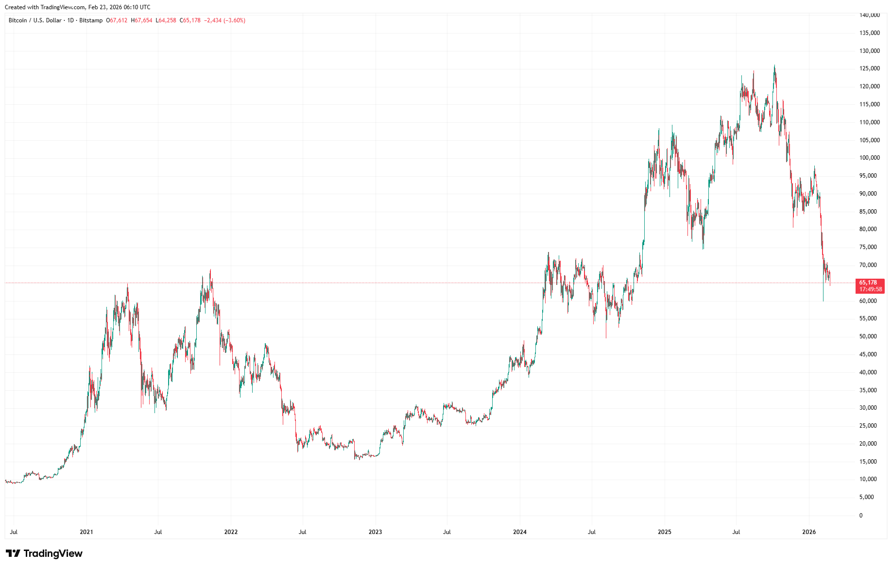 Bitcoin erreichte am 6. Oktober 2025 ein Allzeithoch über 126'000 USD. Damals trieben Hoffnungen auf eine krypto-freundlichere Trump-Administration die Kurse. Seitdem ist Bitcoin um fast 50 Prozent gefallen. Der gesamte Krypto-Markt schrumpfte von einem Rekord bei 4.4 Billionen USD um 44 Prozent auf rund 2.3 Billionen USD. Das entspricht einem Rückgang von etwa 2 Billionen USD.