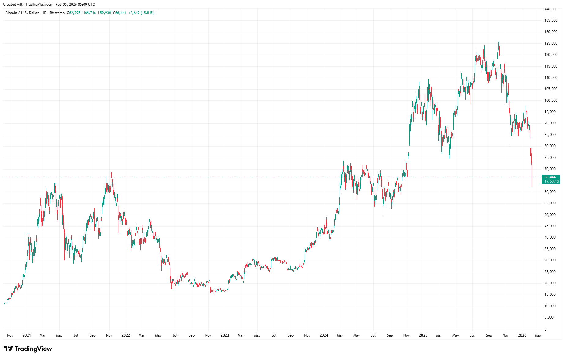 Vom Allzeithoch über 127'000 Dollar im Oktober 2025 beträgt der Verlust mittlerweile knapp 50 Prozent. Damit sind sämtliche Gewinne seit der Wahl von Präsident Donald Trump im November 2024 vollständig ausgelöscht. Bereits am 5. Februar durchbrach Bitcoin die 70'000-Dollar-Marke nach unten. Seit Mitternacht betrug der Intraday-Rückgang 10.5 Prozent - der stärkste Tageseinbruch seit dem Kollaps von FTX am 8. November 2022. In 24 Stunden fiel der Kurs um bis zu 15 Prozent und berührte kurzzeitig die 60'000-Dollar-Marke.