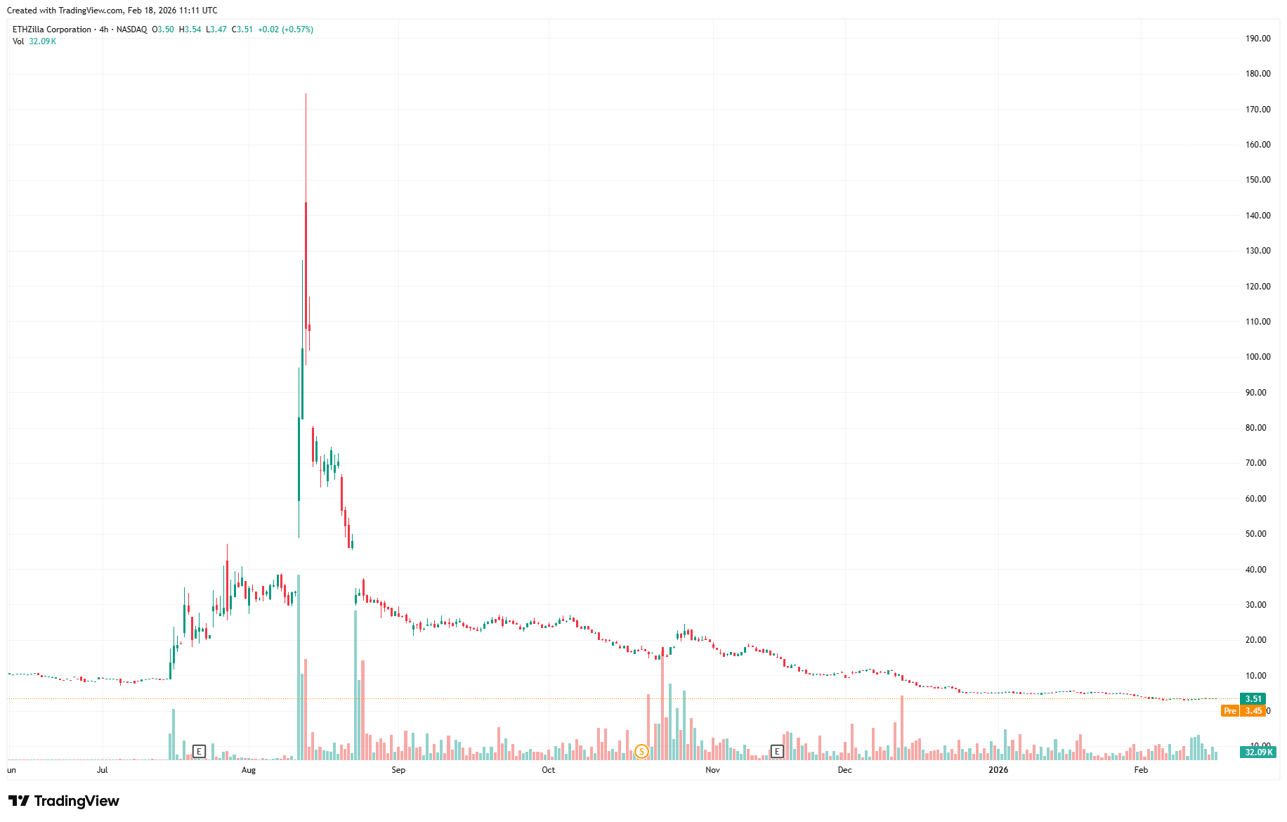 Von 107 USD im August 2025 auf 3.20 USD im Februar 2026 - der Absturz der ETHZ-Aktie fiel drastisch aus. Sowohl unternehmensspezifische Probleme als auch die schwache Ethereum-Preisentwicklung trugen dazu bei. ETH verlor im vierten Quartal 2025 rund 28 Prozent, das erste negative Q4 seit 2022. Im Januar 2026 fiel der Kurs um weitere 18 Prozent. Aktuell handelt ETH unter 2'000 USD.