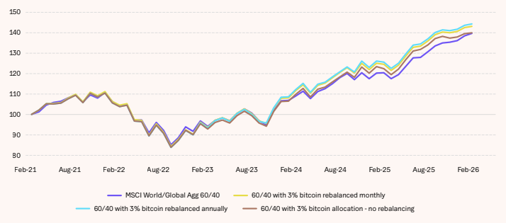 Der Bericht hebt zudem das hohe Konzentrationsrisiko hervor, dem ein typisches 60/40-Portfolio derzeit ausgesetzt ist. Rund 25% des Aktienanteils entfallen nämlich auf nur acht US-amerikanische Technologiegiganten. Die Einbindung einer moderaten Bitcoin-Allokation von 3% sorgt für eine wertvolle Diversifizierung.