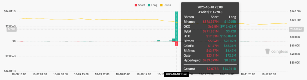 Die folgenden Grafiken machen den Ablauf der Marktbereinigung sichtbar. Der erste Chart zeigt die Futures-Liquidationen auf den grössten Börsen. Die Konzentration der Abwicklungen um 23 Uhr verdeutlicht, mit welcher Geschwindigkeit der Grossteil der rund 20 Milliarden USD an Positionen liquidiert wurde.