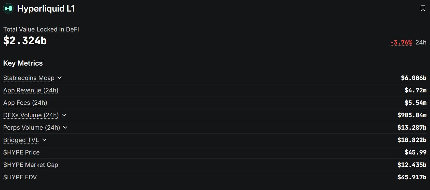Bevor die Technologie und die Produkte im Detail betrachtet werden, lohnt sich ein Blick auf die aktuellen Kennzahlen. Der Token HYPE wird derzeit bei knapp 46 US-Dollar gehandelt, was dem Projekt eine Marktkapitalisierung von gut 15.5 Mrd. USD beimisst. Auf DefiLlama wird ein Total Value Locked von rund 2,3 Milliarden US-Dollar ausgewiesen. Das tägliche Volumen im Perpetual-Handel liegt aktuell bei über 13 Milliarden US-Dollar. Diese Werte verdeutlichen, dass Hyperliquid innerhalb kurzer Zeit zu einem der zentralen Akteure im Markt für DeFi-Derivate aufgestiegen ist.