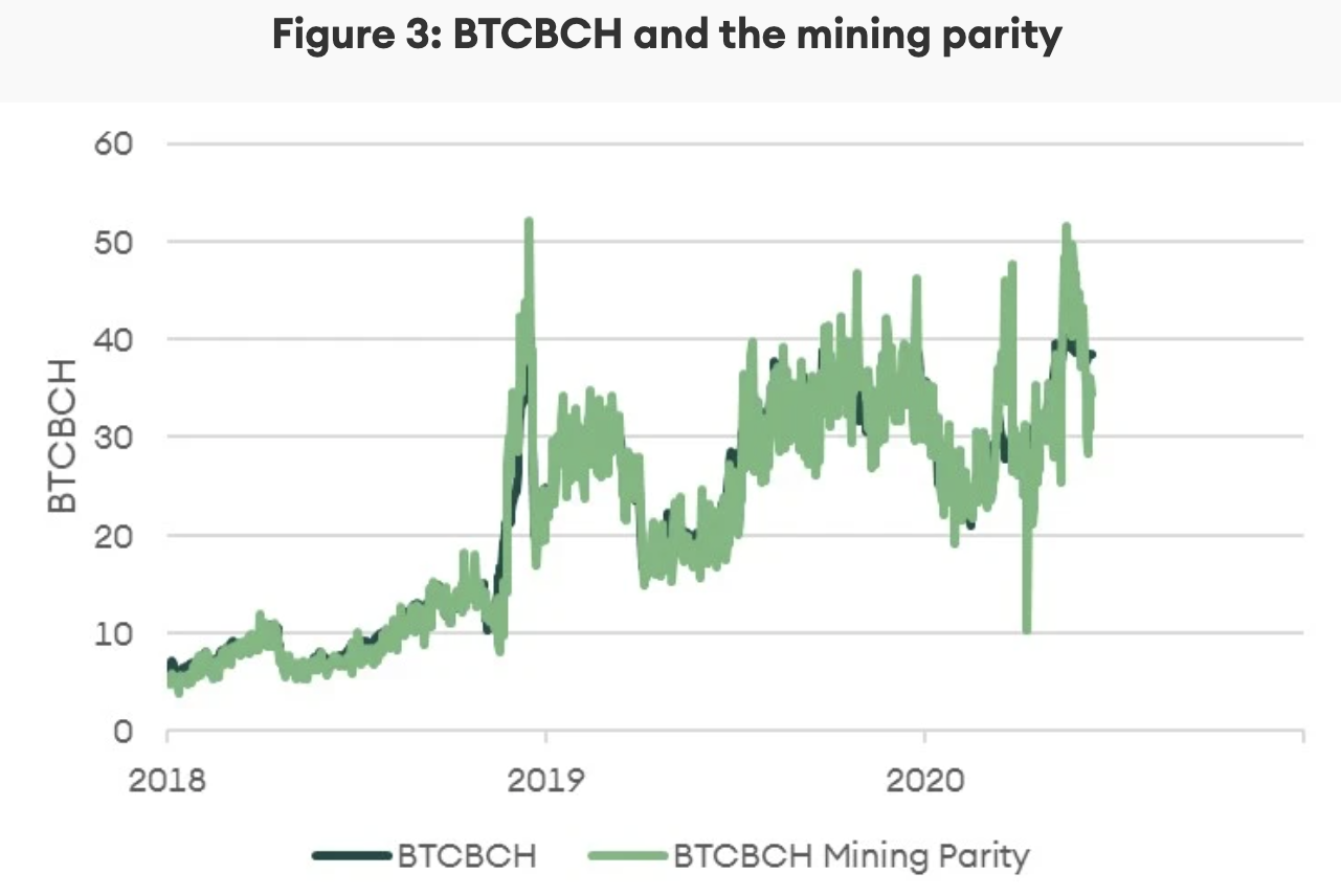 Unter Berücksichtigung dieser Beobachtungen liefern Fair-Value-Modelle aufschlussreiche Signale für langfristige Investoren und grosse Preisunterschiede. Kurzfristig ist ihre Anwendung jedoch begrenzt. Daher schlagen wir eine auf der Mining-Aktivität aufbauende Arbitrageverbotsbedingung vor: den Ansatz der Mining-Parität. Im Geiste ähnelt er dem Begriff der Münz-Parität [6], der in metallischen Systemen wie dem Goldstandard verwendet wird, um den Preis zweier Währungen zu vergleichen.