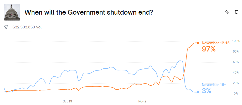 Doch es gibt Licht am Ende des Tunnels. Der US-Senat hat am Montag einen Kompromiss verabschiedet, der den längsten Regierungsstillstand in der Geschichte der Vereinigten Staaten beenden soll. Damit endet eine wochenlange Pattsituation, die Millionen Menschen ihre Lebensmittelhilfen entzog, Hunderttausende Bundesangestellte ohne Gehalt liess und den Flugverkehr teilweise zum Erliegen brachte. Laut der Prognoseplattform Polymarket dürfte die Regierung noch in dieser Woche den Betrieb wieder aufnehmen.