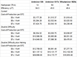 Wenn wir uns die Tabelle in der Schlussfolgerung des beigefügten Berichts ansehen, haben wir eine gute Grundlage, um die zukünftige Hashpower abzuschätzen und wie viel Mühe diese den Minern bereiten wird (angenommen die Energie- und Produktionskosten bleiben unverändert). Hinweis: Die hier aufgeführte Berechnung beinhaltet nicht die Gebühren für den Mining-Pool, die Wartung und die Anschaffungskosten für Hardware. Die tatsächlichen Produktionskosten sind deutlich höher, bis die Anfangsinvestitionen vollständig die Gewinnschwelle erreichen.