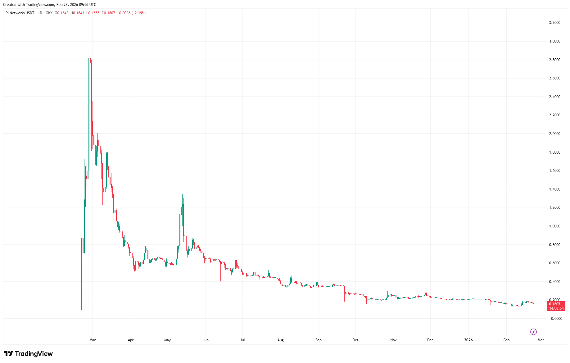 PI eröffnete den Handel bei 1.47 USD und erreichte am selben Tag einen Peak von 2.10 USD. Anschliessend stieg der Kurs Ende Februar 2025 kurzzeitig auf das Allzeithoch von 2.99 USD. Im Mai 2025 trieben Gerüchte über ein Binance-Listing den Preis auf über 1.70 USD. Sie erwiesen sich als falsch. Bis Anfang Oktober 2025 fiel PI auf 0.172 USD - ein Verlust von rund 95 Prozent.