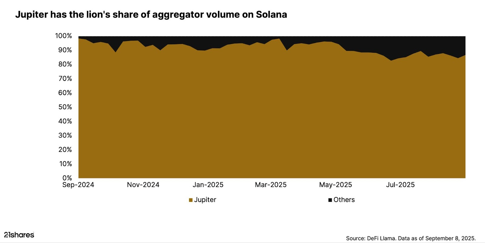 Jupiter hat sich schnell als einer der führenden DEX-Aggregatoren auf Solana etabliert und das Problem der fragmentierten Liquidität gelöst. Anstatt dass Trader manuell zwischen Börsen hin- und herspringen, routet Jupiter als Aggregator Orders über mehrere DEXs, um die besten Preise, den geringsten Slippage und die schnellste Ausführung – alles an einem Ort – sicherzustellen. Es hat bereits über 1 Billion US-Dollar an kumuliertem Handelsvolumen verarbeitet und erfasst mehr als 90% der Aggregator-Aktivität auf dem Netzwerk.