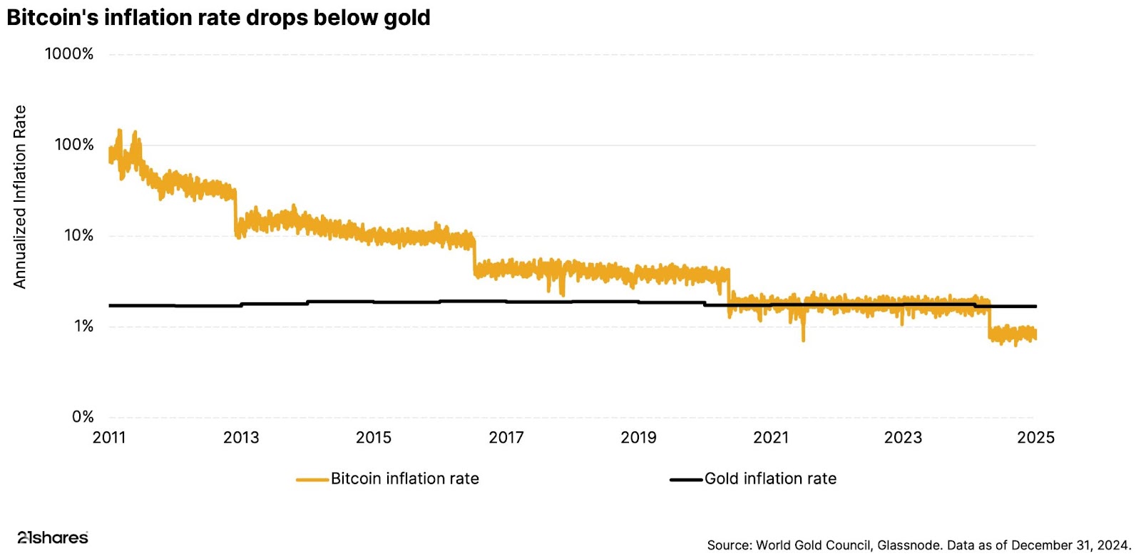 Bitcoin hat ein begrenztes Angebot – es wird nie mehr als 21 Millionen geben. Über 95% davon wurden bereits geschürft, der Rest wird nach und nach über das nächste Jahrhundert freigegeben. Diese eingebaute Knappheit macht Bitcoin inflationsresistent, da niemand auf Knopfdruck mehr davon erschaffen kann. Während auch das Angebot an Gold knapp ist, ist es nicht endlich – zukünftige Mengen hängen von neuen Funden und dem Abbau ab. In den letzten Jahren ist die Inflationsrate von Bitcoin sogar unter die von Gold gefallen. Dies wird als bedeutende Entwicklung gewertet, die Bitcoin möglicherweise von einem volatilen Investment zu einem stabileren Wertspeicher macht.